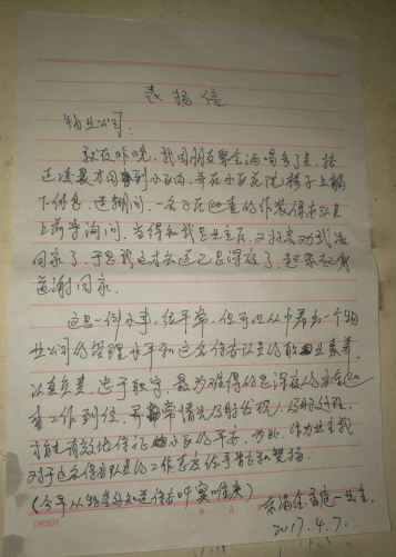 2017年4月6日,金香庭秩序隊員竇唯慶在晚上巡邏時,發(fā)現(xiàn)有一男子躺在小區(qū)中庭椅子上,當時已是凌晨1點,溫度較低,僅有10度左右,秩序隊員擔心男子受寒,主動勸導其回家休息。第二天清晨,男子親自寫上表揚信交于客服中心,表示感激之情。軒安物業(yè)正在用實際行動,不斷把服務業(yè)主的大小事做到最好,不斷規(guī)范軒安物業(yè)的服務標準,讓每一位業(yè)主都能感受到回家的溫暖。軒安物業(yè),親情管家,讓更多的人享受幸福生活。