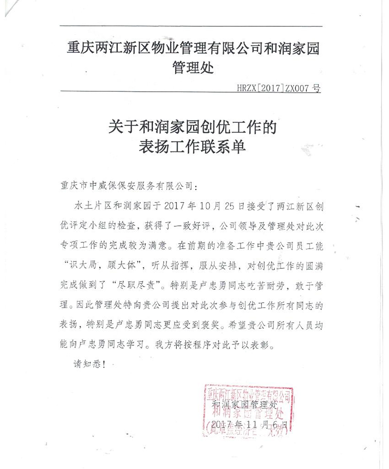 11月6日,來自和潤(rùn)家園管理處在表揚(yáng)信中這樣寫道:貴公司員工識(shí)大局,顧大體,聽從指揮,服從安排,對(duì)創(chuàng)優(yōu)工作的圓滿完成盡職盡職。特別是盧忠勇同志吃苦耐勞,敢于管理。因此,管理處特向貴公司提出表揚(yáng),希望貴公司所有人員能像盧忠勇同志學(xué)習(xí)......